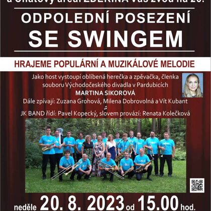- 20. srpna 2023 se uskutečnilo v pořadí již 26. odpolední posezení se swingem. I tentokrát byla účast publika hojná a všichni jsme si společně koncert velmi užili. Bylo sice přes 30 stupňů a opravdu veliké horko, ale zvládli jsme to... taky mohlo pršet a být chladno :-)